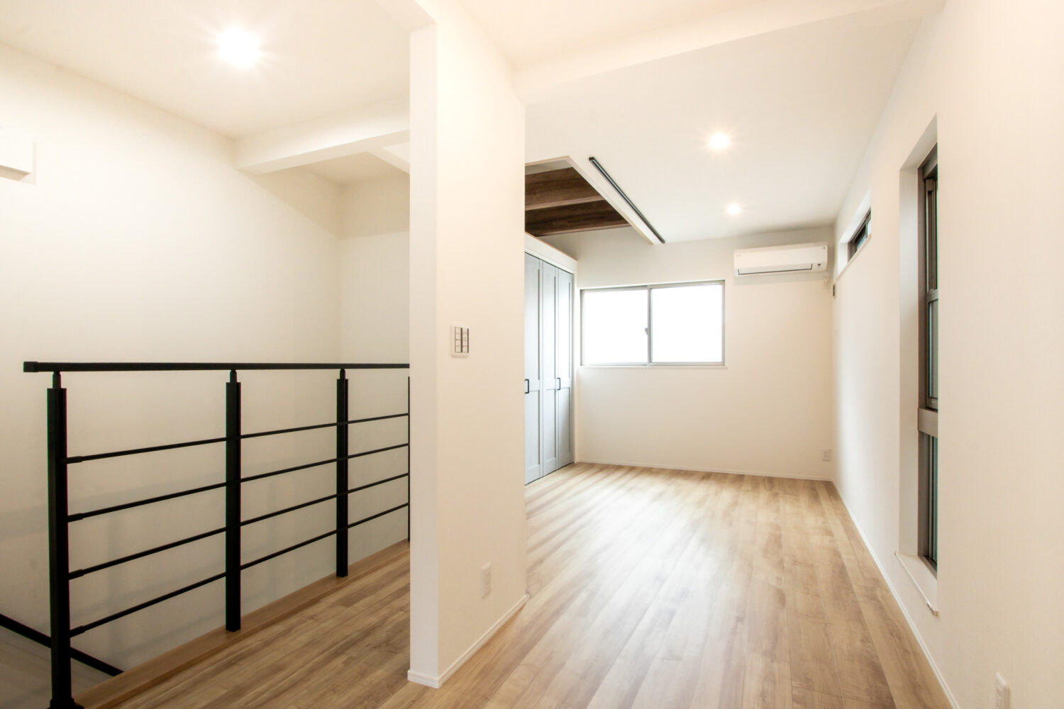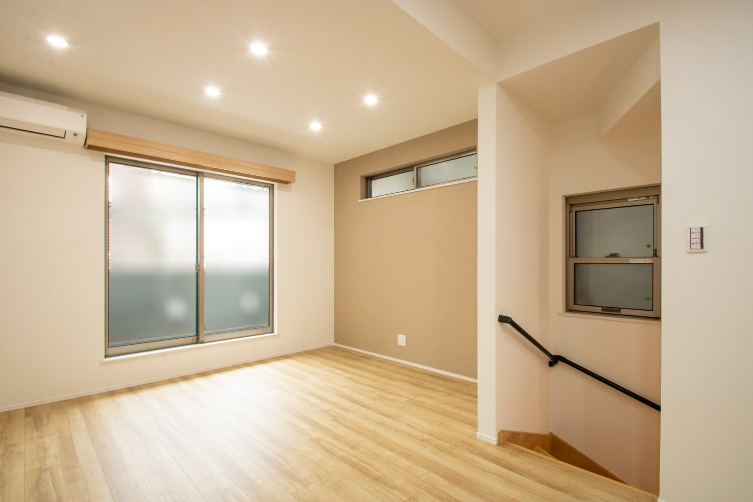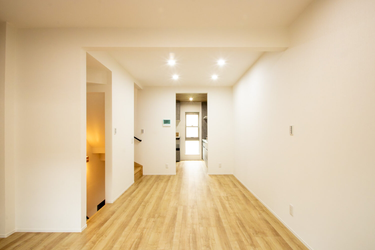 白を基調とした空間に合わせた、淡い色合いのフローリングが空間全体を調和。
