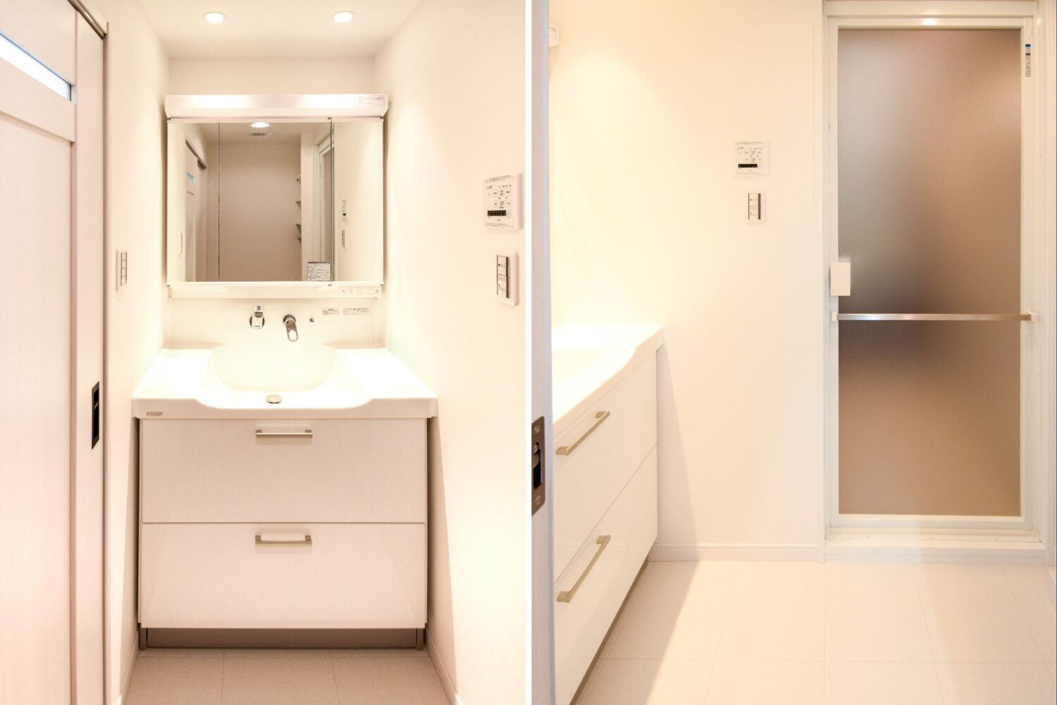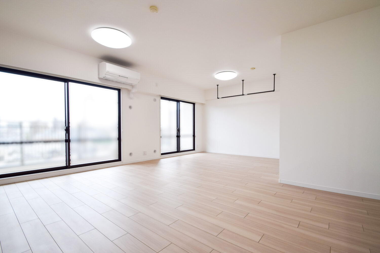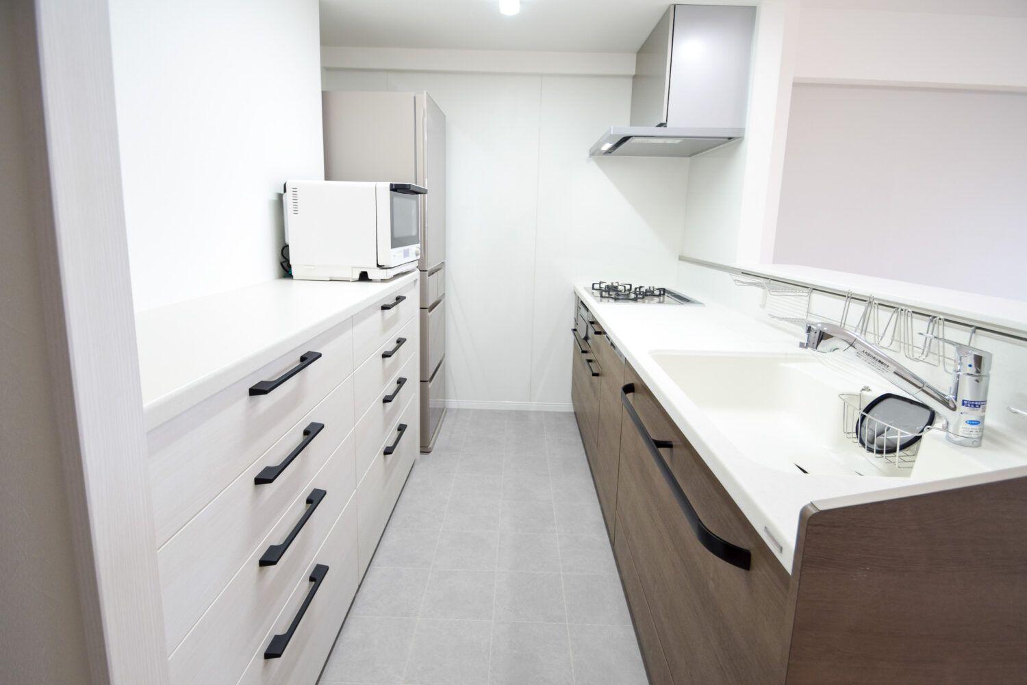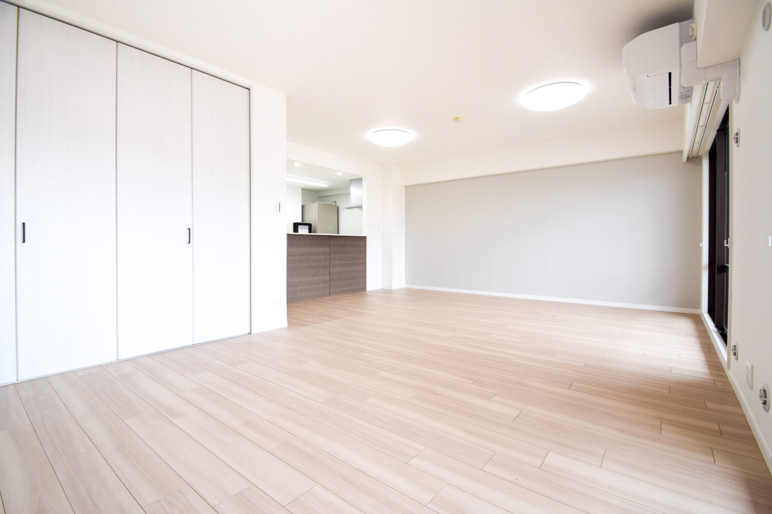 白い壁と天井が空間を広く見せ、トレンドの床色で洗練された印象へ。