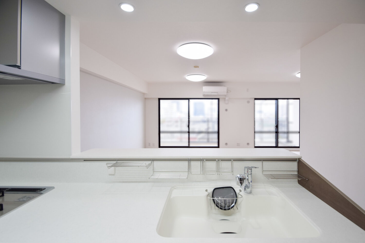 明るい照明とシンプルなデザインで開放感あふれるキッチンへ。