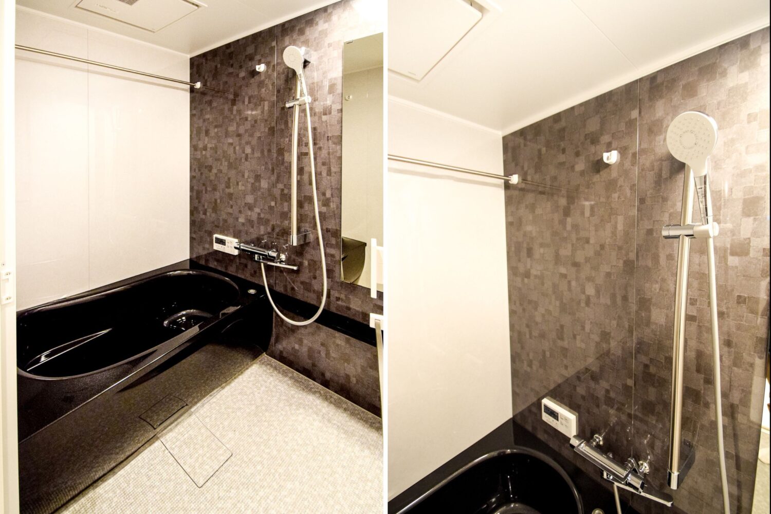 ブラックの浴室が空間を引き締め、モダンで洗練された印象に。