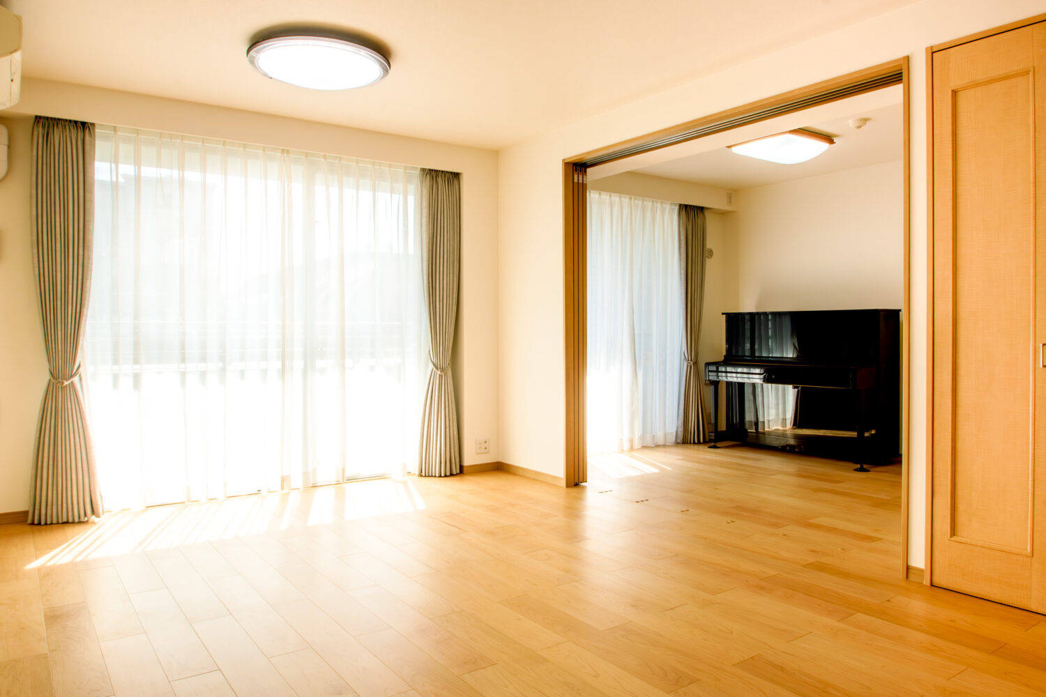 玄関から続く統一感ある木目で広さを演出し、スライドドアで空間の使い方に柔軟性をプラス。