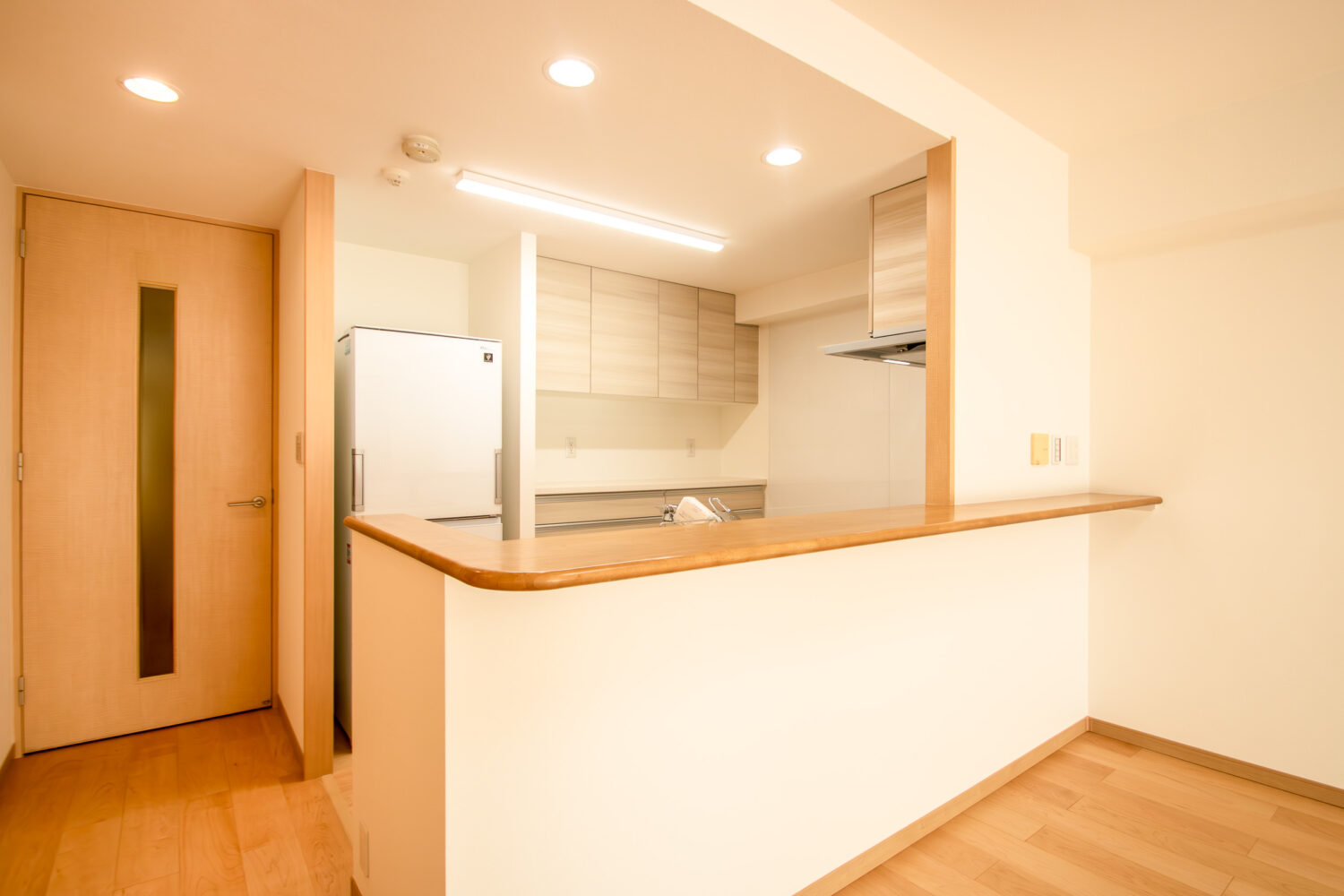壁・天井は白を基調に、清潔感と広さを演出。間仕切りを開放し、対面式で会話の弾むキッチンへ。
