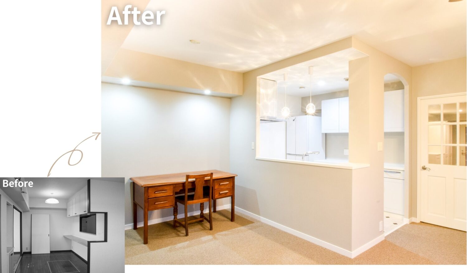 キッチンの入口をアーチ開口にすることで、優しく温かみのある印象にしました。