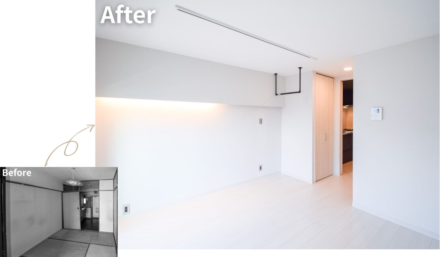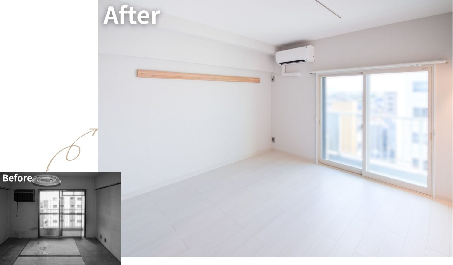 天井・壁・床をすべてリニューアルし、エアコンも新調しました。 同じ部屋とは思えないほど明るい空間に。